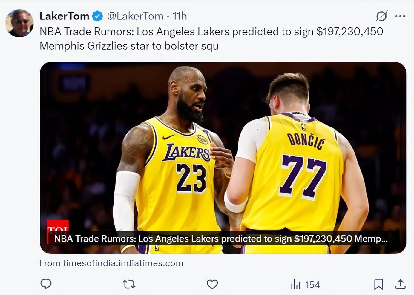 5月10日時,BR記者埃裏克-平卡斯建議湖人在休賽期追逐加福德,因爲加福德與東契奇在獨行俠搭檔很默契。