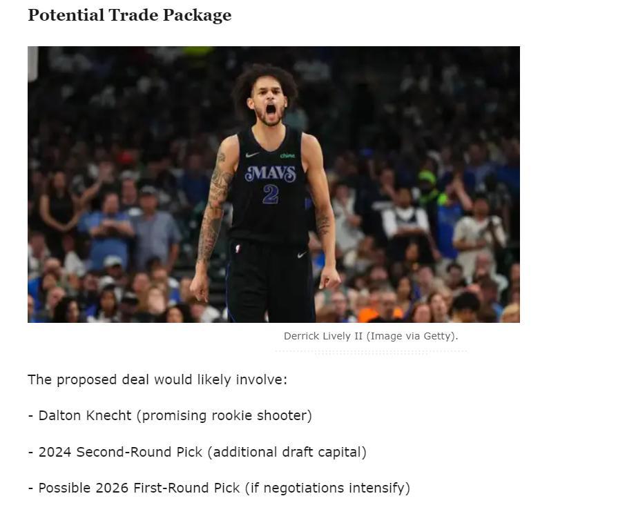 交易得到萊夫利的方案是用年輕資產克內克特、2024年次輪籤、2026年的首輪籤,這筆3換1的交易換來萊夫利,萊夫利只有21歲他與東契奇匹配,未來他與東契奇會成爲球隊的內外線核心。