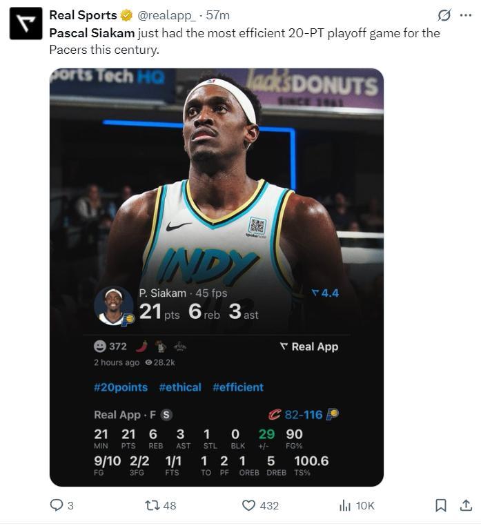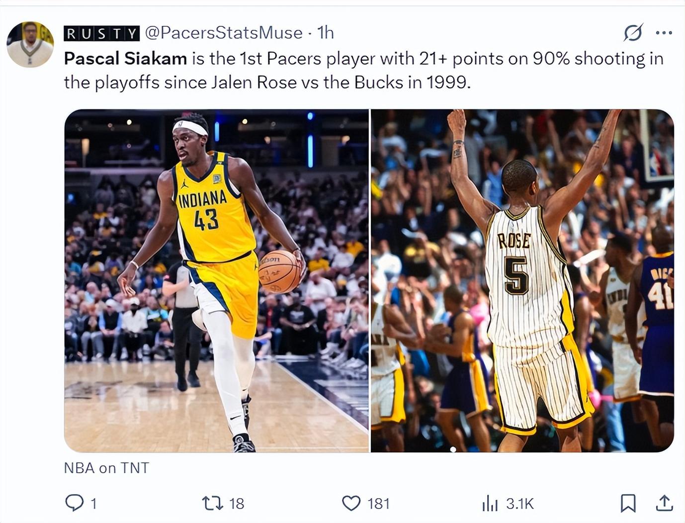 2.西卡成爲步行者隊史本賽季效率最高的20+先生。