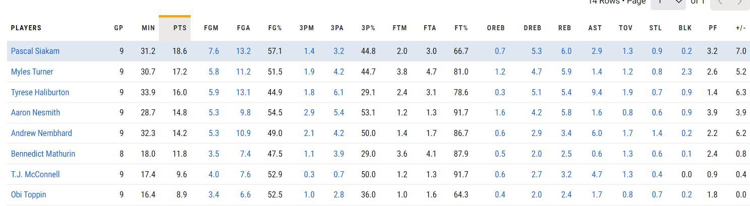 他的得分是步行者第一,籃板也是第一,三分命中率是主力輪換第四,正負值也是第一,9場比賽合計+63。