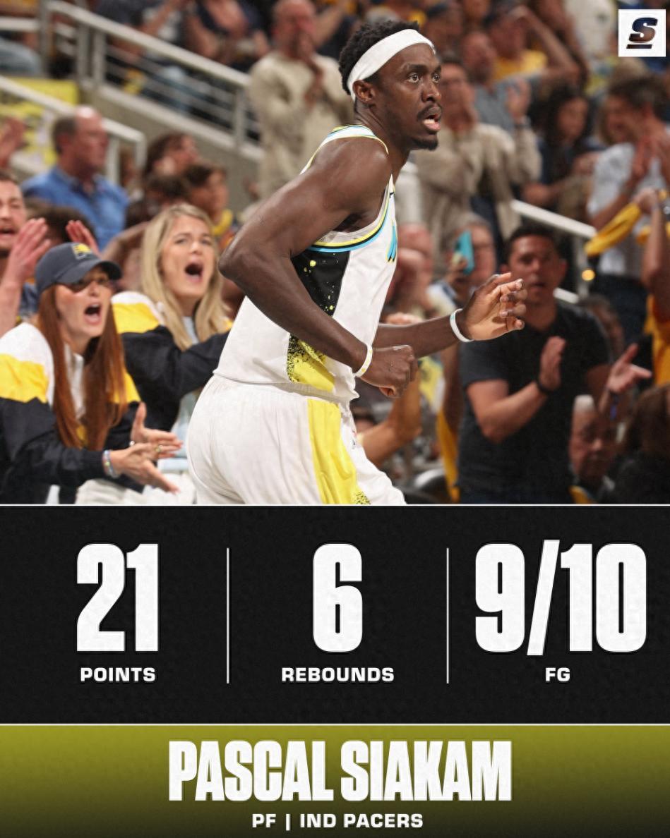 帕斯卡爾-西亞卡姆在G4一戰中僅僅登場21分鐘,10中9,三分2中2,拿到21分6籃板3助攻1搶斷僅1失誤,命中率90%,三分命中率100%,真實命中率100.6%,正負值+29。