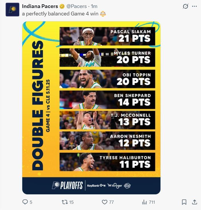 這場G4步行者是全隊開花,可西卡是效率最高的那個,特納13中7+三分4中4,託平14中9+三分4中1,哈利伯頓8中3+三分5中1,麥康9中5+三分2中1,內史密斯8中4+三分4中2,內姆布哈德7中3+三分2中1。
