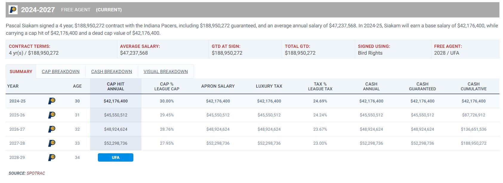 去年夏天步行者與西卡提前續約四年1.88億,當時很多人還覺得溢價,如今西卡纔是最穩的尖刀,還覺得溢價嗎?本賽季他年薪4217萬。