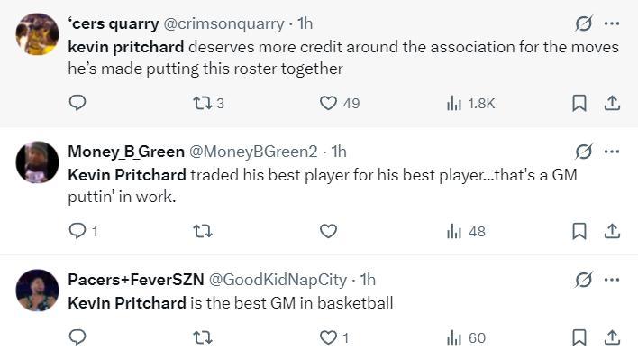 這場比賽步行者7人上雙+三人20+,球迷們都在盛讚西亞卡姆、卡萊爾、特納、託平等人,但步行者隊記Jake Welnbach認爲幕後的影響是總經理凱文-普理查德。