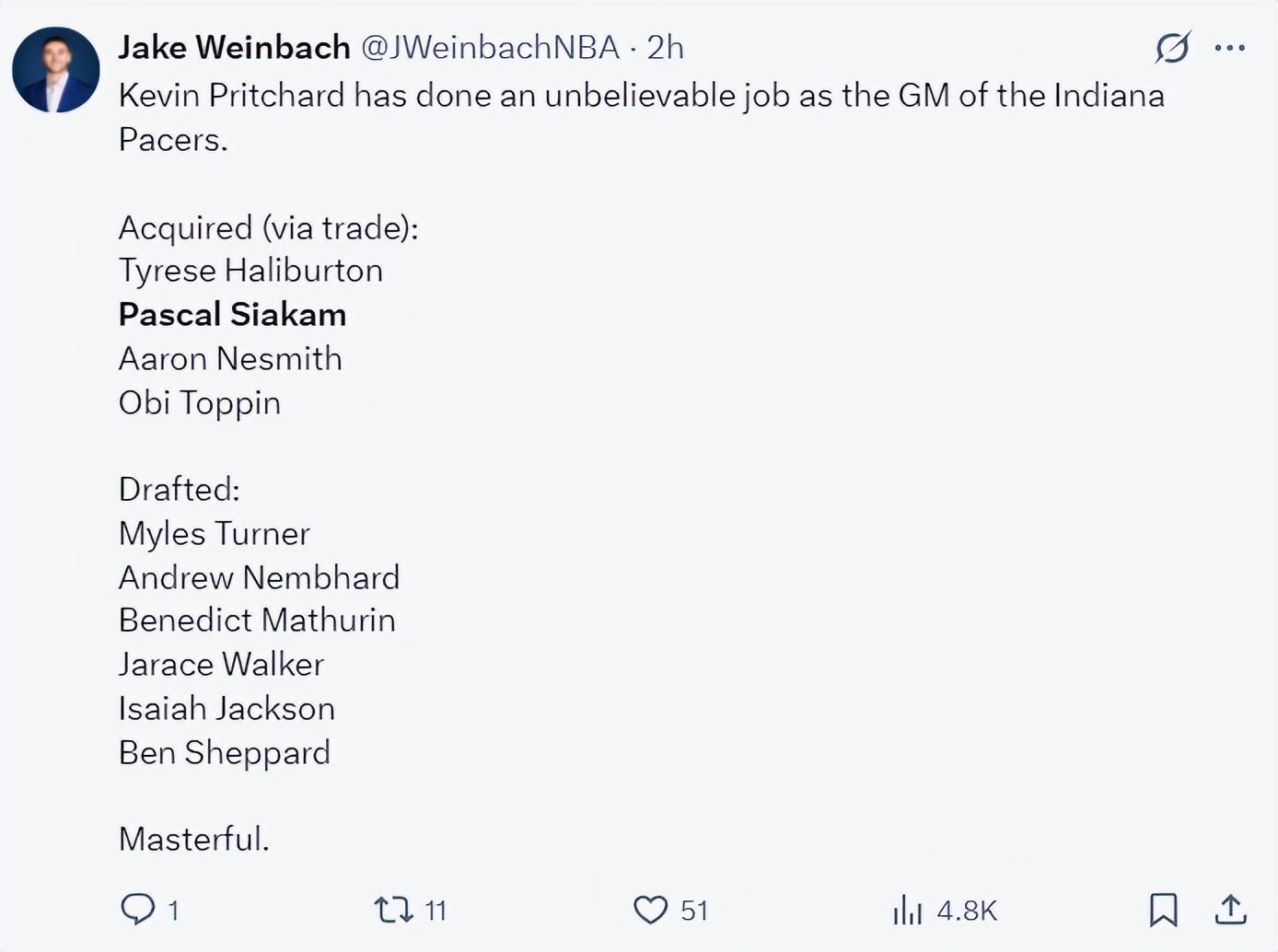 步行者隊記 Jake Welnbach曬出普總的功績,通過交易得到哈利伯頓、西亞卡姆、內史密斯、託平,通過選秀得到特納、內姆布哈德、馬瑟林、賈拉斯-沃克、以賽亞-傑克遜、本-謝潑德。