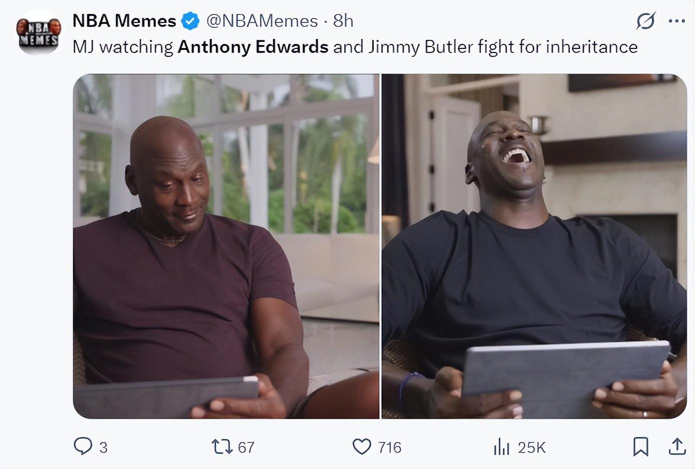 美媒NBA Memes調侃:愛德華茲與巴特勒爲了爭奪喬丹“遺產”大打出手,最終華子贏了。(MJ私生子之爭華子最終獲勝)