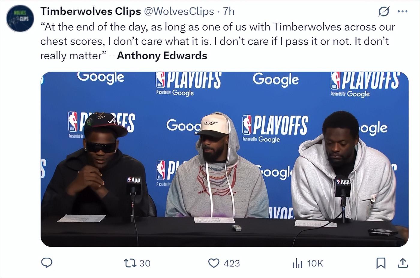 不過在比賽結束後華子的高情商發言是這樣:最終只要是身穿森林狼球衣的球員得分就行了。我不在乎是我得分還是我傳球隊友得分,這些都不重要。