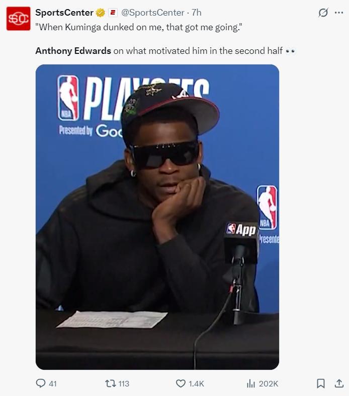 勇士與森林狼比賽最精彩的一球,就是第三節安東尼-愛德華茲高高躍起隔扣凱文-魯尼這球,這一球發生在第三節還剩1分48秒,這一扣之後愛德華茲進入了Zone,巴特勒跟他相比完全敗下陣來。