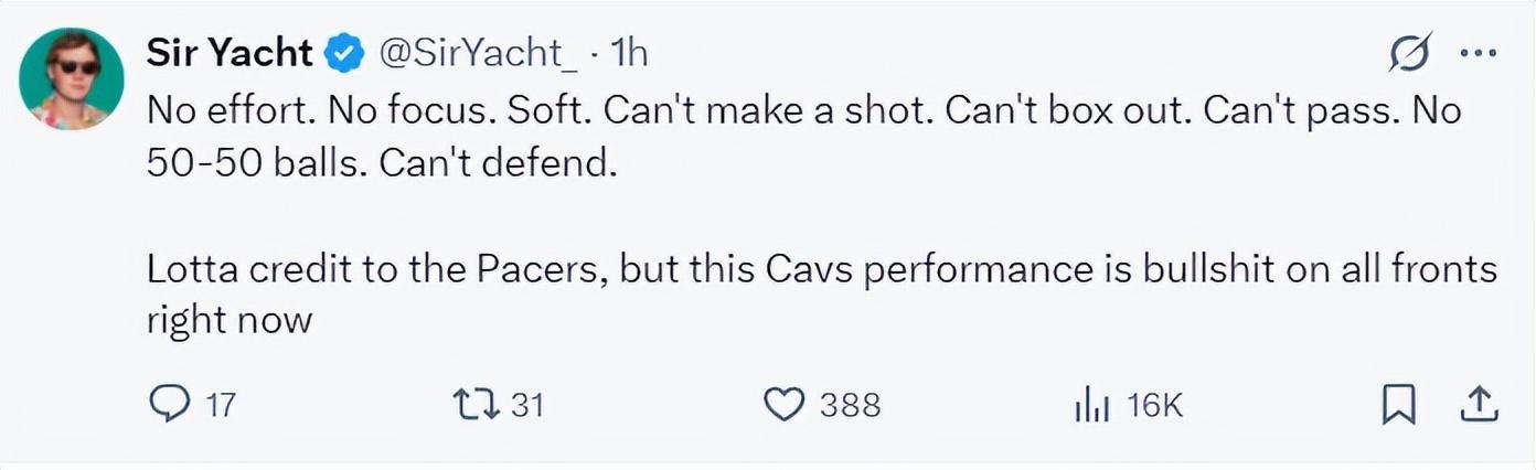 克城記者:騎士沒有努力、沒有專注、動作遲緩、投籃打鐵、封蓋無力、傳球失誤,這不是一場正常的比賽,防守端也沒有積極性。目前的騎士隊表現糟糕透頂,各個方面都是如此。