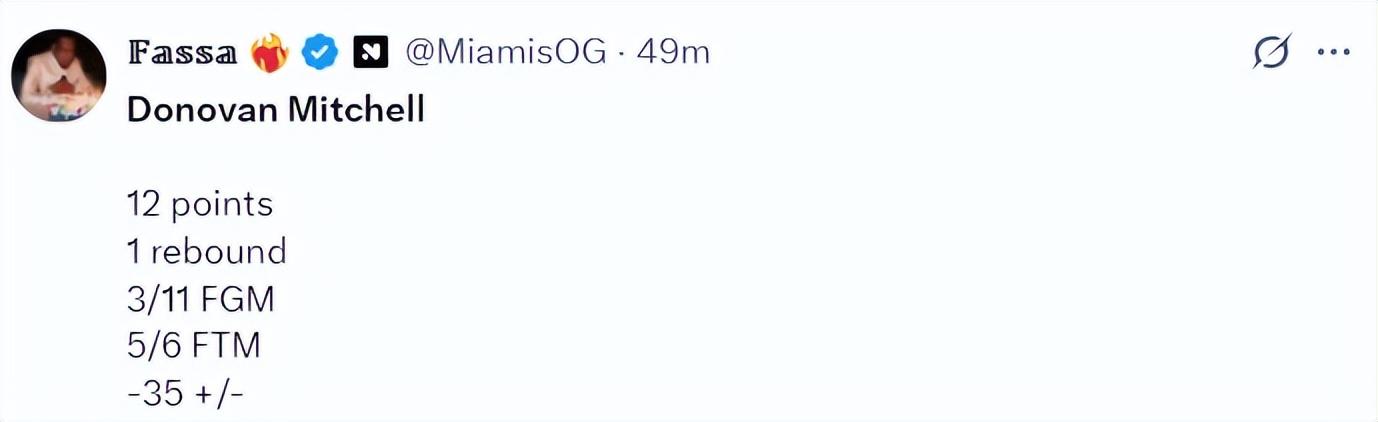 第三節米切爾是一分鐘沒有打,上半場他打了20分鐘,11中3+三分5中1,拿到12分1籃板0助攻1搶斷1蓋帽2失誤,命中率33.3%,三分命中率20%,正負值-35。