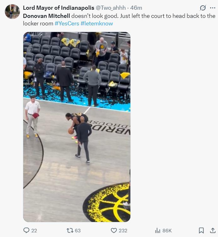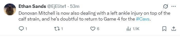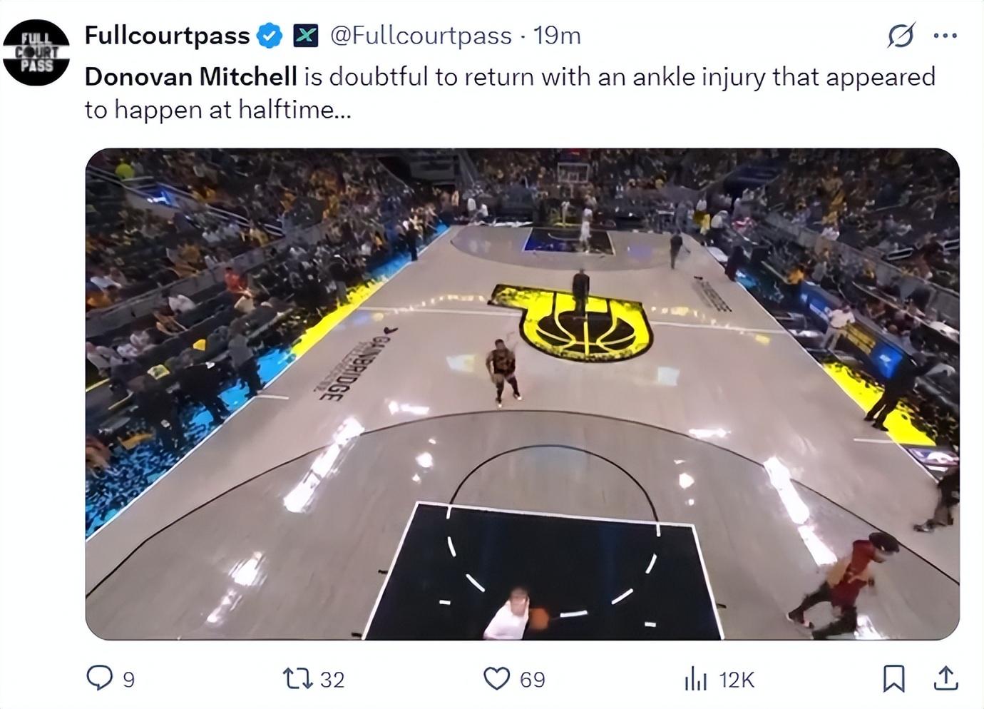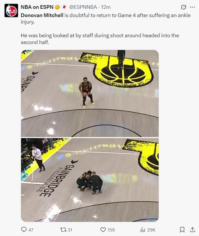 ESPN表示:米切爾在G4比賽中場遭遇腳踝傷勢,他在下半場熱身時的一次出手中受傷,隊醫詢問他傷情,隨後米切爾被攙扶下場,G4能否登場還不確定。