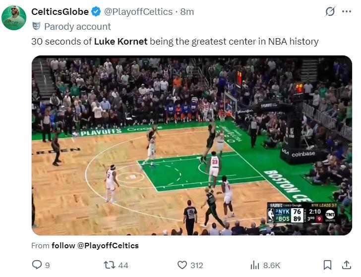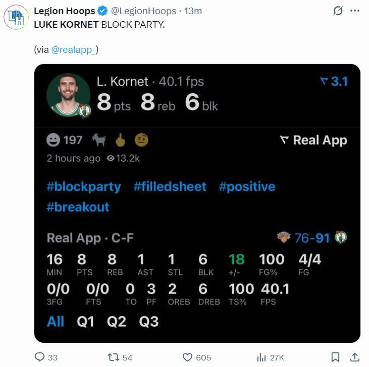 北京時間 5月15日,綠凱以127-102擊敗尼克斯,大比分扳成2-3。這場比賽凱爾特人防守端的奇兵是盧克-科內特,這位29歲身高2.18米的內線如同擎天柱一般連續護框成功,全場比賽送出了7次封蓋,第三節是他引爆了北岸花園,要知道他的合同僅208萬而已。