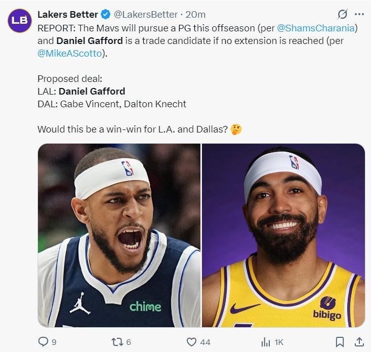 湖人媒體寫道:早些時候Shams透露獨行俠想在歐文傷缺階段爲球隊找到一個先發後衛,湖人可以用文森特+克內克特去換獨行俠的中鋒加福德,這筆交易雙方都有益處。