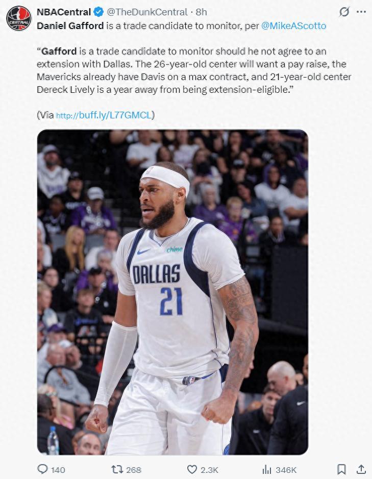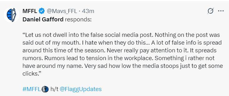 獨行俠媒體發佈了此前加福德面對流言的發聲:“別信那些虛假的社交媒體帖子,那些都不是我親口說的,我討厭聽到這些東西,每年都有這些虛假的信息流傳,我從來關注這些,他們就是傳播謠言。”(但交易流言實際上跟他本人的意願沒什麼關係,球隊不需要得到他的同意)