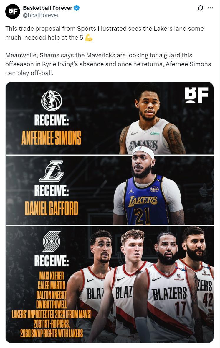美媒BF更是列出一筆三方交易方案,湖人得到加福德;開拓者得到安芬尼-西蒙斯;開拓者得到克勒貝爾、鮑威爾、凱萊布-馬丁、克內克特、2029年獨行俠首輪籤、2030年湖人首輪互換權、2031年湖人首輪互換權。(這筆交易獨行俠也得到了歐文的替身西蒙斯)