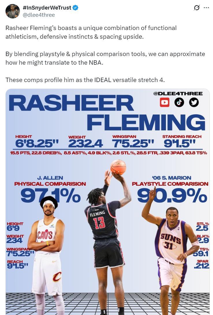 弗萊明是一個大齡新秀,他今年已經20歲 ,他在NCAA已經打拼三年所以他是即戰力,本賽季他場均14.7分8.5籃板1.4搶斷1.5蓋帽1.3助攻,命中率53.1%,三分命中率39%,真實命中率高達63.8%,場均出手4.5個三分。
