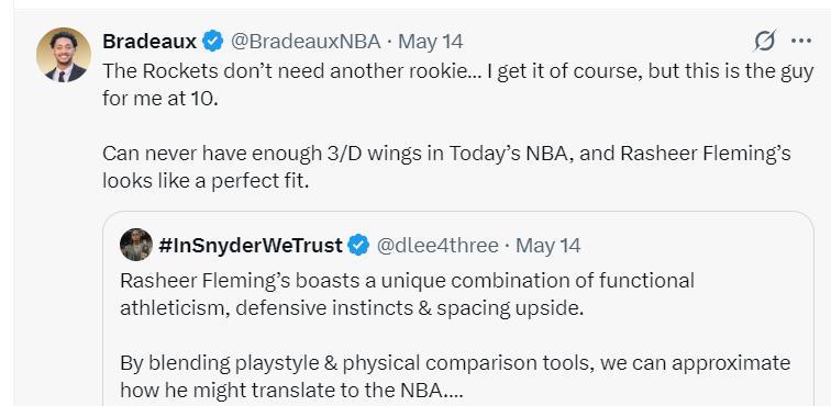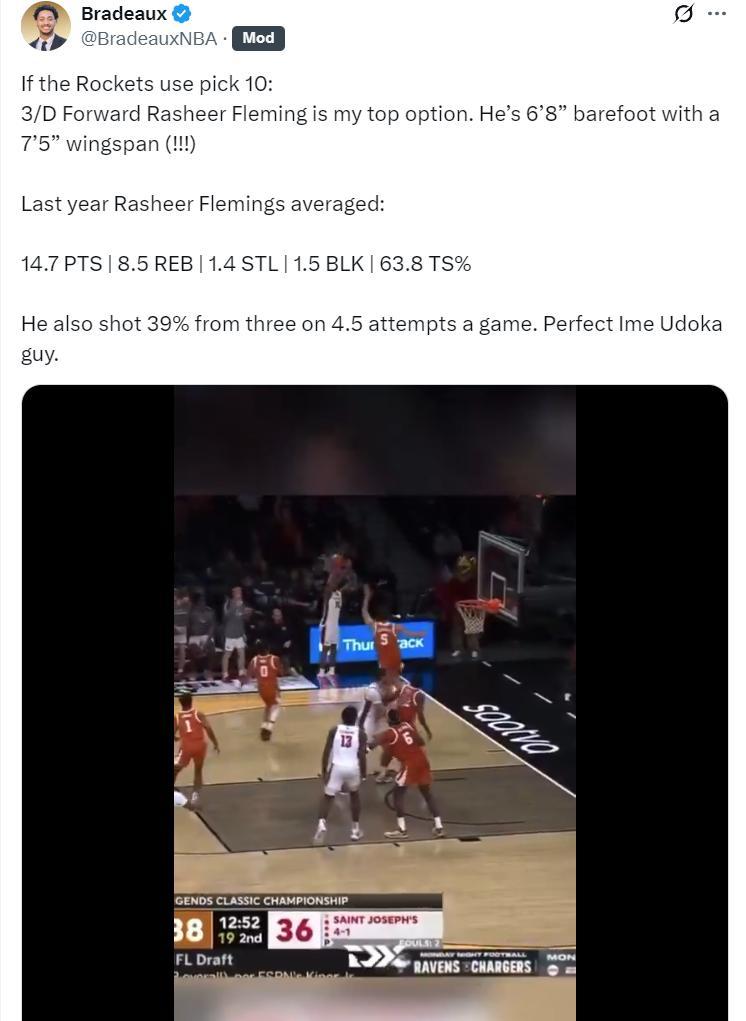 休媒Bradeaux寫道:火箭實際上已經不需要再多一個新秀了這一點我當然明白,但這是我覺得最適合10號籤的球員。在如今的NBA,三分側翼永遠不夠,弗萊明看起來是火箭完美的選擇。
