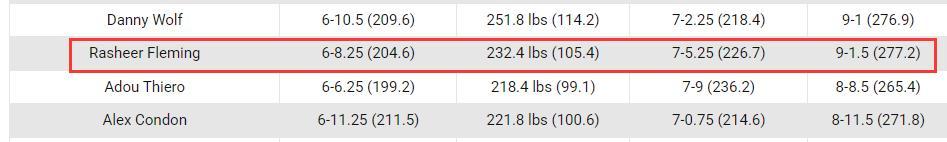 弗萊明的體測數據也沒有太大的注水,裸足204.6釐米,臂展226.7釐米,體重105.4公斤,站立摸高277.2釐米。