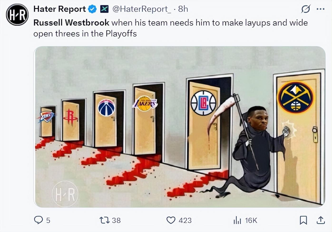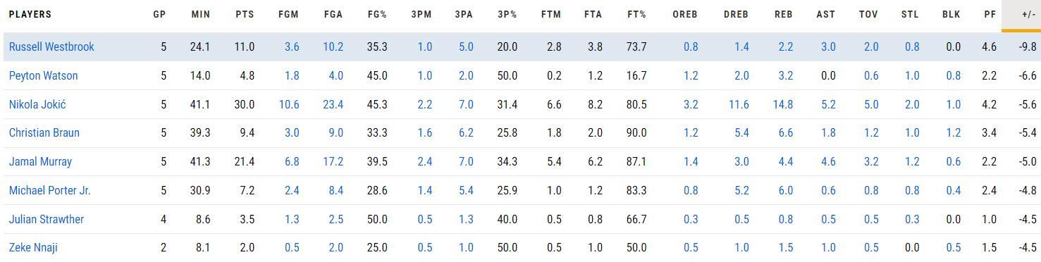 次輪威少場均-9.8分,五場系列賽合計-49掘金最爛,場均24.1分鐘拿11分2.2籃板3助攻2.2失誤0.8搶斷,命中率35.3%,三分命中率20%。他這是怎麼了?
