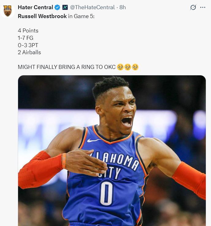 這場天王山威少20分鐘,7中1,三分3中0,拿到4分4籃板3助攻1搶斷2失誤,命中率14.3%,真實命中率25.4%,決勝時刻只打了1分鐘就被DNP了。