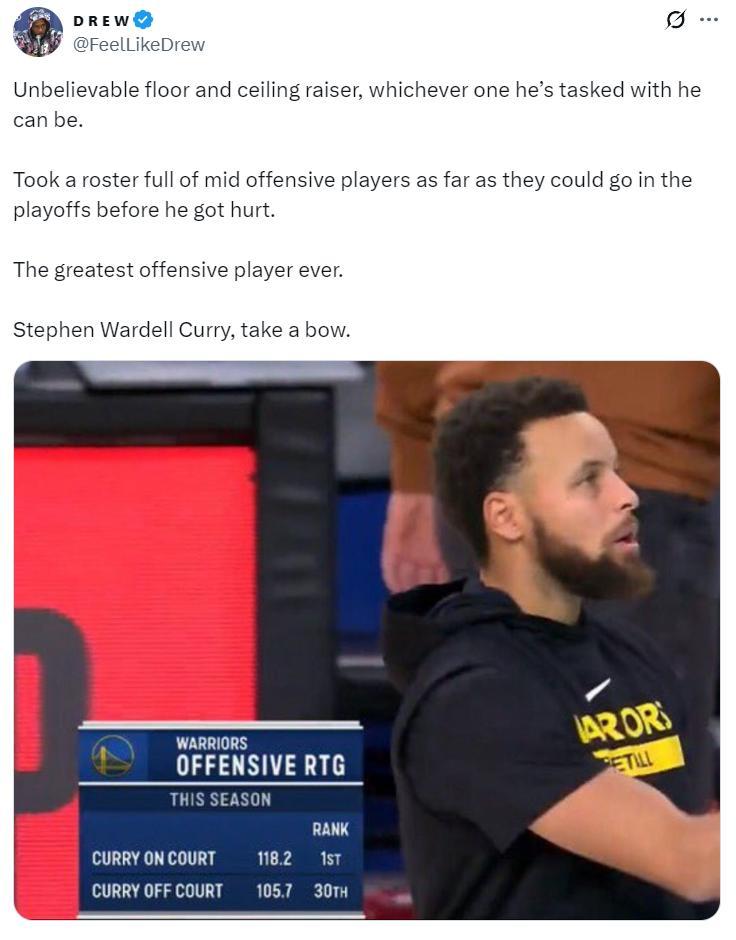 費城媒體曬出庫裏登場與不在場球隊的進攻效率,在場118.2聯盟第一,不在場105.7聯盟第30,盛讚庫裏是歷史最出色的進攻超巨,向他脫帽致敬。