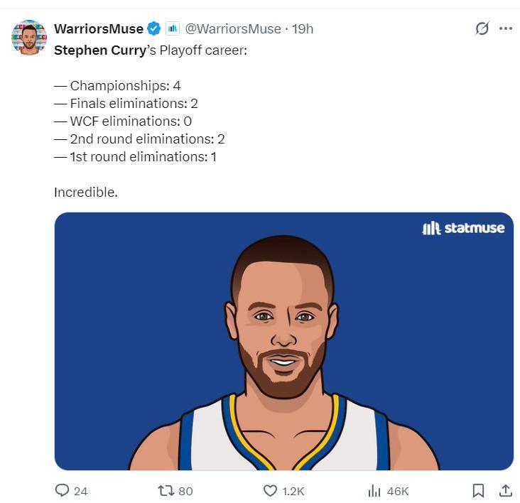 勇媒曬出庫裏季後賽履歷:4總冠軍、2次總決賽被淘汰、0次分區決賽被淘汰、2次分區半決賽被淘汰,1次首輪被淘汰。