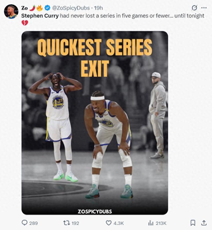 斯蒂芬-庫裏今年季後賽吞下恥辱紀錄,他生涯首次在一輪系列賽5場被淘汰,此前他至少都可以打到G6,也是庫裏生涯首次在季後賽四連敗。