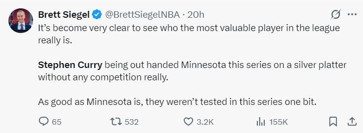 NBA記者Brett Siegel寫道:從勇士與森林狼的系列賽中就能知道這個聯盟的MVP是誰,沒有庫裏的勇士面對森林狼毫無還手之力,儘管森林狼很強可沒有庫裏就沒有任何挑戰。