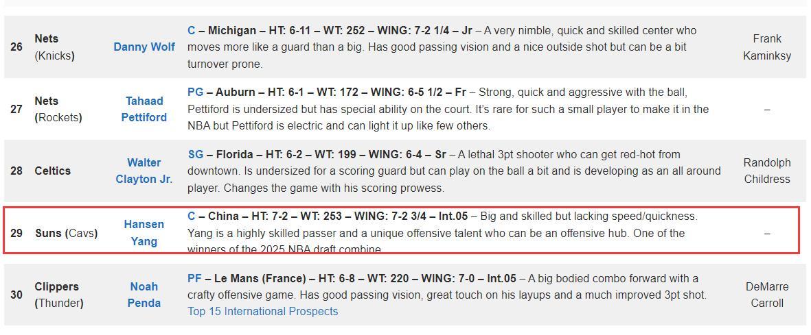 根據NBA Draft Room最新一期選秀模擬,楊瀚森已經升至第29順位了,要知道在小楊參與聯合試訓之前他的選秀順位是次輪55順位,如今小楊已經進入首輪末,這是巨大的提升,因爲次輪55順位可以給雙向合同,而首輪秀必須給四年新秀合同。