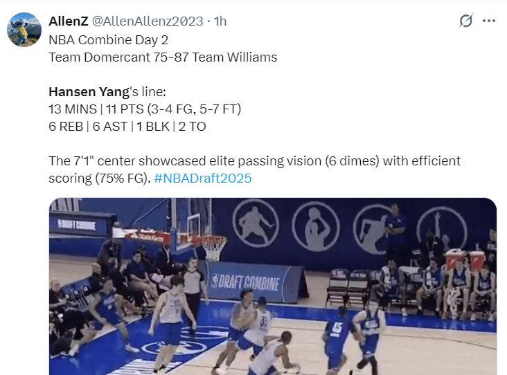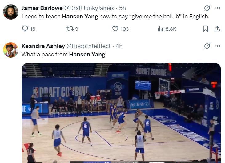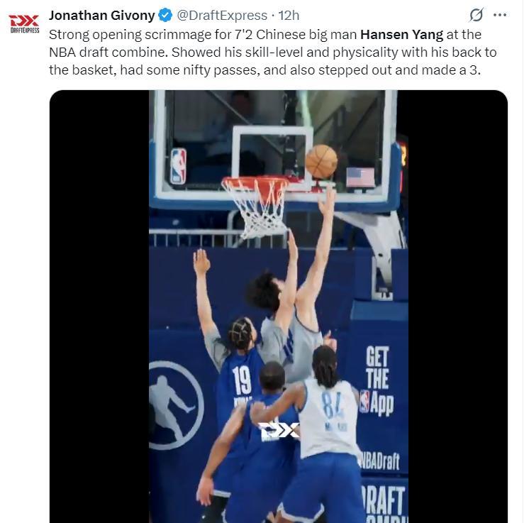 選秀專家喬納森-基沃尼寫道:來自中國7尺2寸的楊瀚森在場上展現出極強的求勝慾望,他展示了自己出色的技術水平與身體天賦,背對籃筐有很多漂亮的傳球,他也能拉出去命中三分。