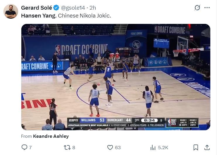 選秀記者Gerard Sole寫道:楊瀚森就是中國約基奇。