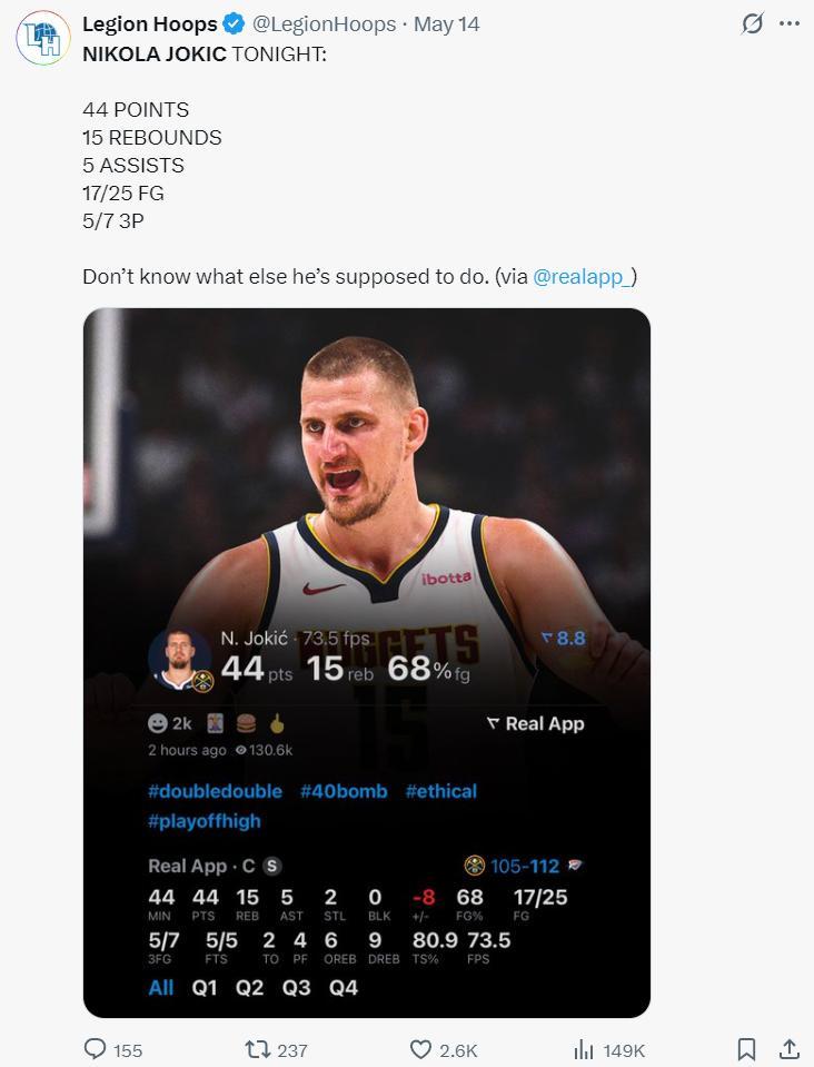 尼古拉-約基奇在天王山一戰付出一切,鏖戰44分鐘,25中17,三分7中5拿到44分15籃板5助攻2搶斷,真實命中率高達80.9%,末節約基奇6中4,而其餘的隊友是15中1,只能說約基奇被隊友坑苦。