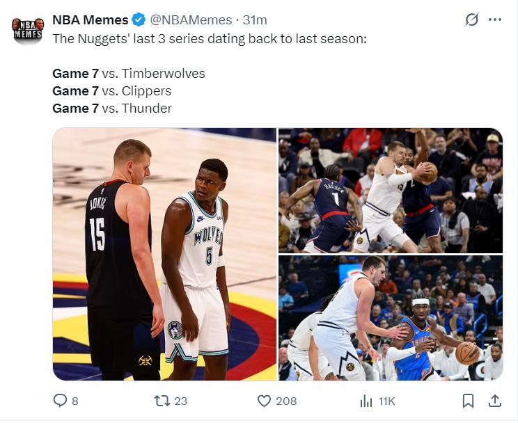 美媒:掘金如果算到上賽季已經連續三個系列賽搶七了,掘金VS森林狼搶七,掘金VS快船搶七,掘金VS雷霆搶七。