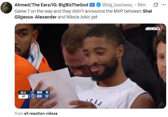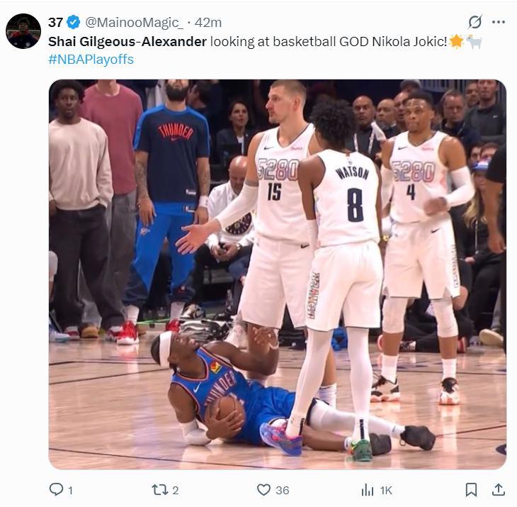 全場比賽SGA32分6助攻3籃板2失誤,命中率68.8%,三分命中率50%,但美媒還是嘲諷他:亞歷山大在地板上看着他的GOAT尼古拉-約基奇。