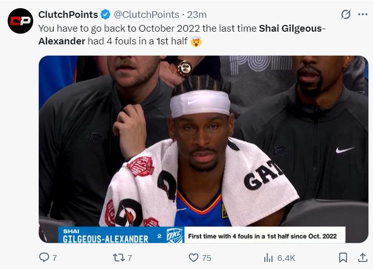 美媒寫道:SGA上一次在上半場4次犯規還要追溯到2022年10月第二節還剩3分59秒SGA只能被換下。