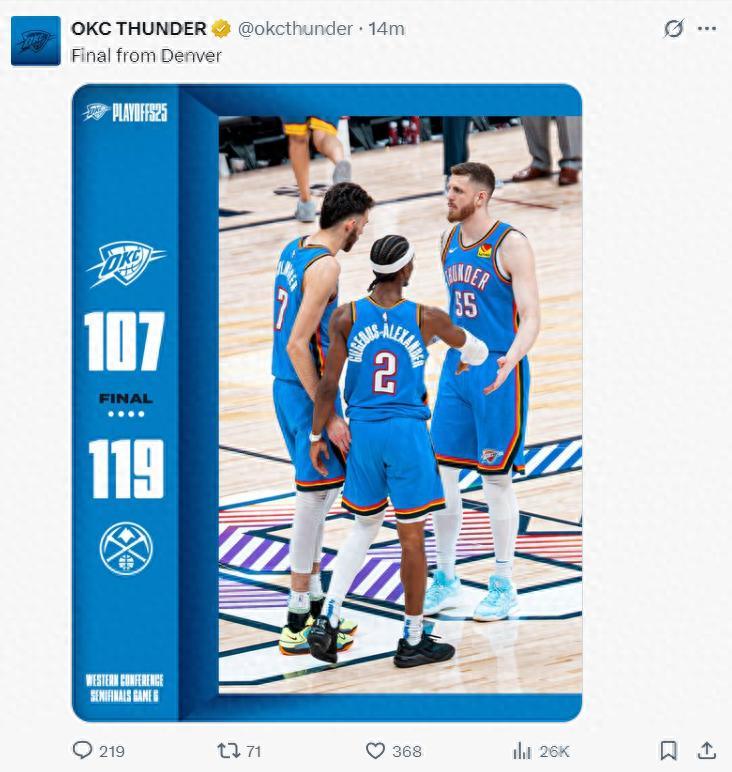 美記:雷霆與掘金即將打搶七大戰,但聯盟還沒有公佈聯盟的常規賽MVP。(暗示搶七決定MVP歸屬)