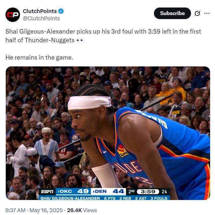 SGA在上半場就出現了4次犯規,首節1次犯規,第二節三次犯規,第二節的第三次犯規是被約基奇搶斷後的反搶,他直接拉拽了約基奇的手臂,半場4犯對於雷霆來說是一個隱患。