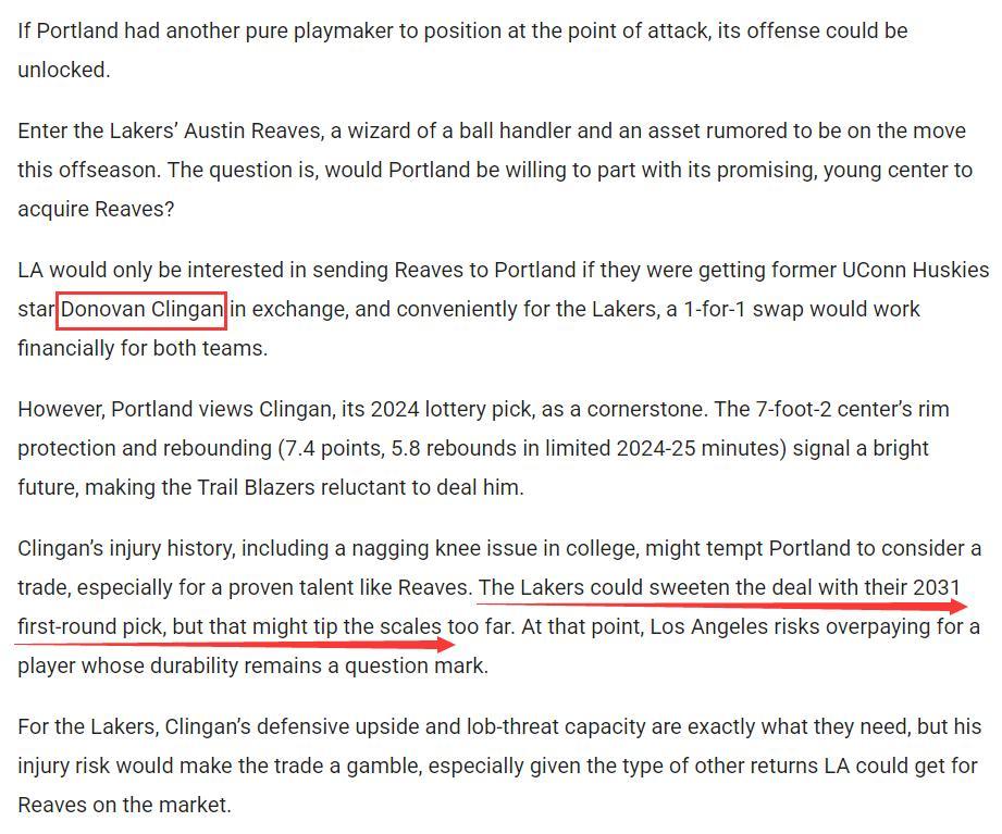 考慮到克林根在NCAA時期的膝蓋傷病史,只要湖人願意送出裏夫斯+2031年不保護首輪,開拓者是可能願意的。