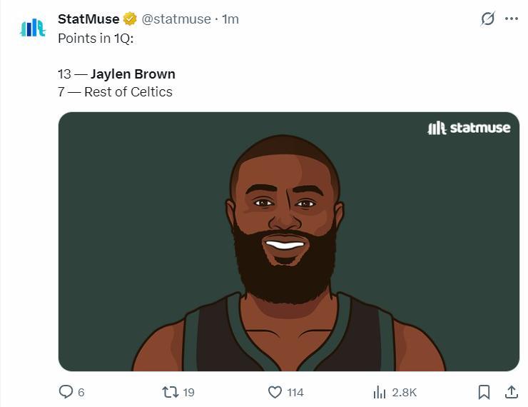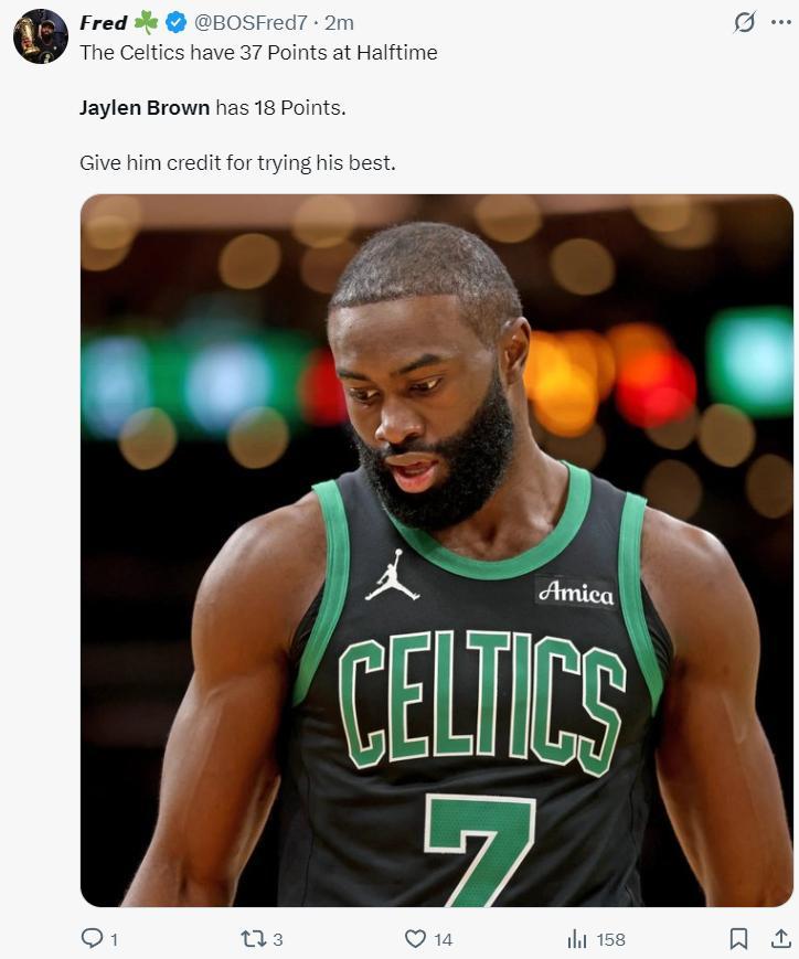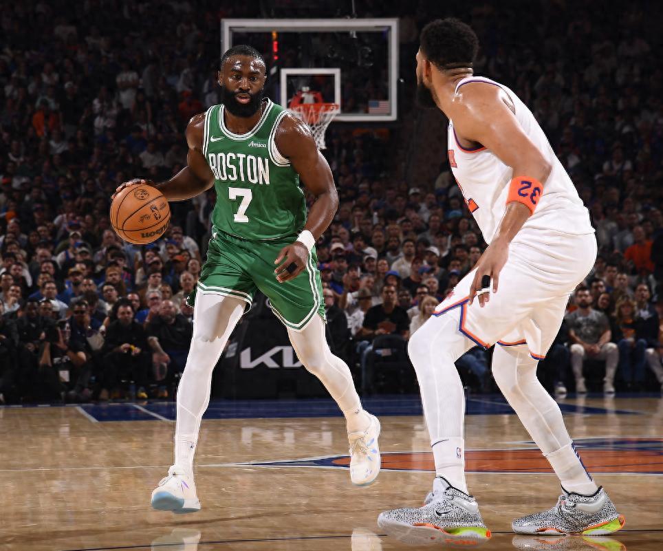 第二節的杰倫-布朗也陷入了沉寂,因爲尼克斯這邊開始包夾他,這讓布朗剛剛登場就出現了兩個失誤,這一節布朗合計出現了4個失誤,單節5中2+三分3中1拿到5分1籃板3助攻1蓋帽,半場打完布朗18分3助攻2籃板1蓋帽6失誤,失誤率過高。