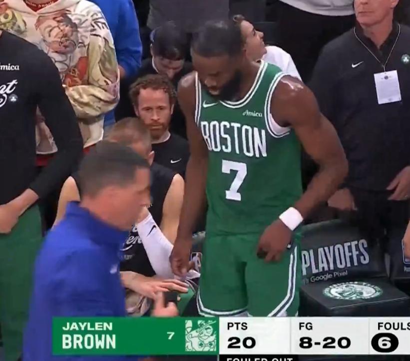 北京時間5月17日,凱爾特人VS尼克斯G6第三節還沒打完,杰倫布朗已經喫下第六次犯規只能下場觀戰,他僅僅出戰31分47秒而已,這場比賽綠凱三節已經落後30+大勢已去。