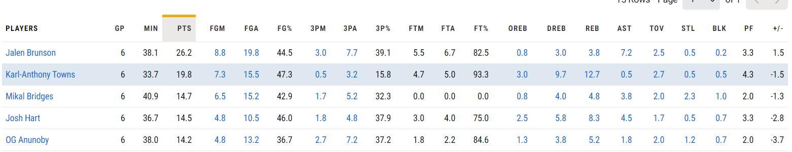 唐斯次輪六場比賽,場均33.7分鐘,拿到19.8分12.7籃板0.5助攻0.5搶斷0.5蓋帽,命中率47.3%,三分命中率15.3%。