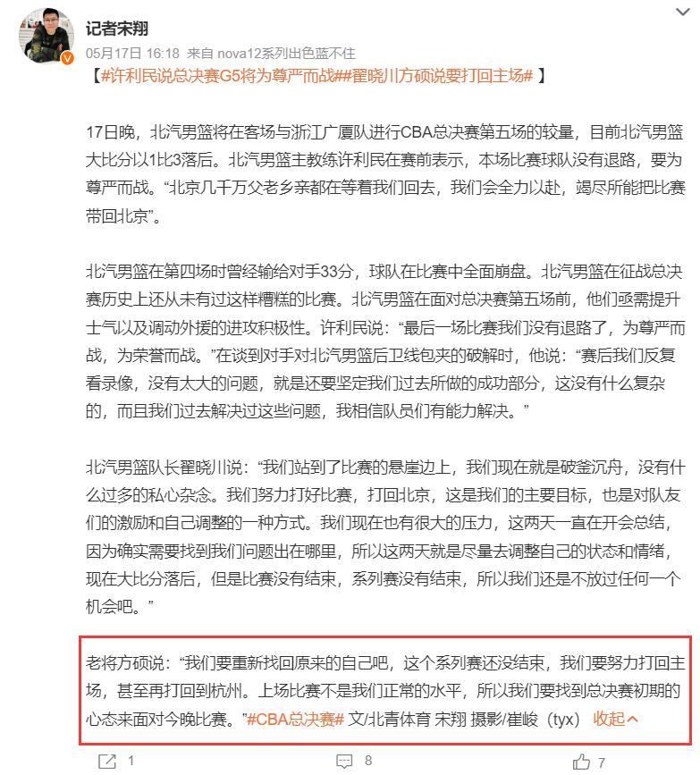 北京男籃在客場驚險過關,最終依靠翟曉川的兩罰幫助球隊拿下勝利,北京將系列賽拖到第六場,G6將在北京打響,系列賽北京還沒有在主場贏過球。這場比賽北京如果輸球,方碩就是第一大罪人,他除了首節那兩個中投外其餘時間都是戰犯一樣的存在。