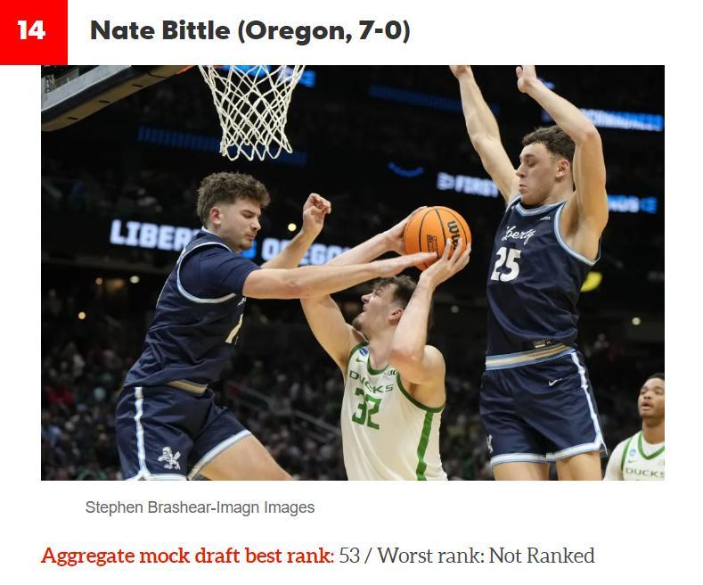 來自俄勒岡州立大學的內森-比特身高7尺(2.13米),他今年已經21歲,在NCAA打磨了四年的他預測順位53,上賽季場均14.2分7.6籃板2.1蓋帽,命中率51.1%,三分命中率33.6%。