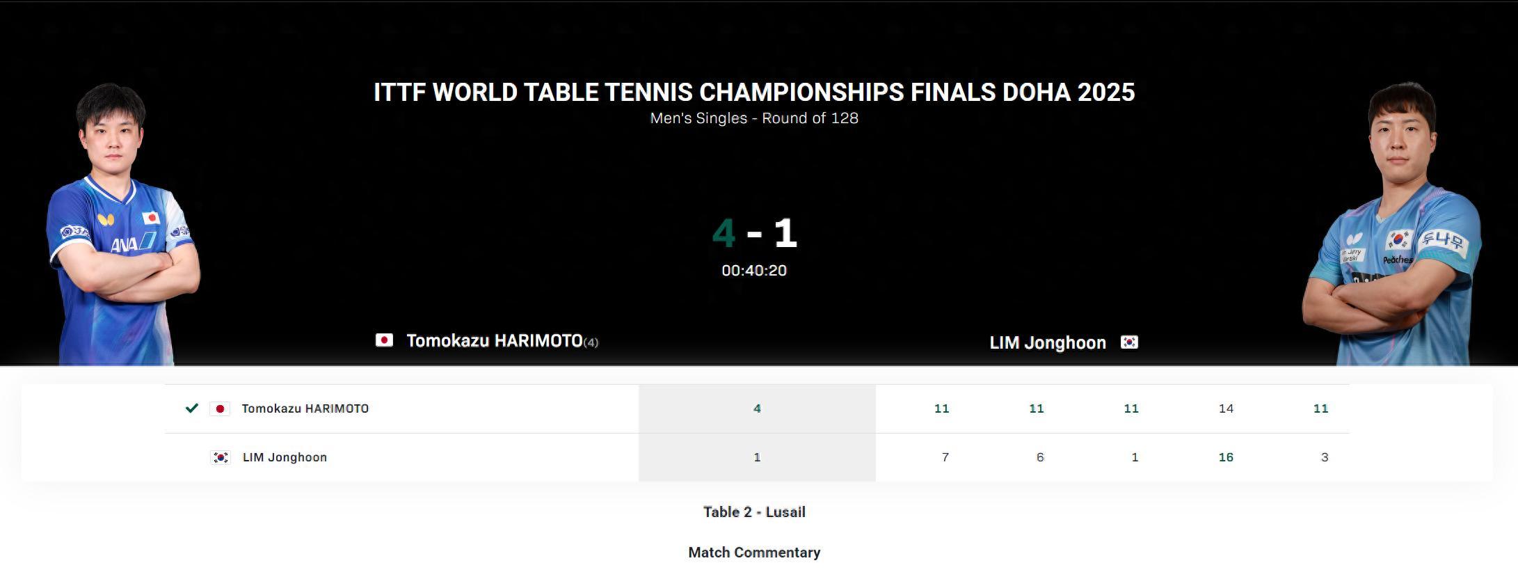 北京時間5月18日,多哈世錦賽男單1/64決賽,日乒選手張本智和4-1輕取韓乒選手林鐘勳,五局比分:11-7、11-6、11-1、14-16、11-3。這場比賽除了第四局都是一邊倒,而且此役張本智和第四局疑似胳膊不適。
