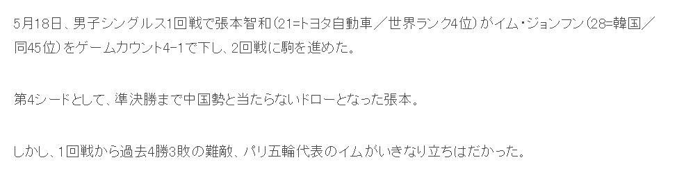 文中寫道:21歲世界排名第四的張本智和再度迎來28歲世界排名45的林鐘勳,這兩人過去的4次交手張本智和輸掉三次,這場比賽張本智和算是克服心魔之戰,他以壓倒性的態勢復仇了韓國王牌林鐘勳。