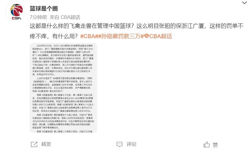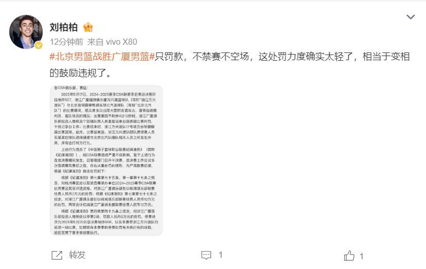 博主劉柏柏寫道:只罰款不禁賽,這處罰力度確實太輕,相當於變相鼓勵違規了。
