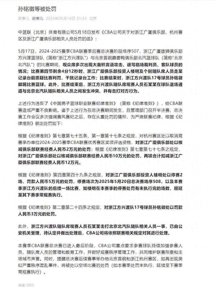 北京時間5月18日,中籃聯對5月17日廣廈男籃VS北京男籃的一些爭議、混亂、衝突進行了處罰,這裏我就直接精簡了: