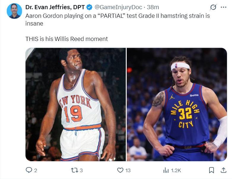 另一專家埃文-傑弗里斯也說戈登只要需要4-6周去康復,他帶着二級拉傷等於是肌腱部分撕裂的大傷登場,這是屬於他的威利-裏德時刻。