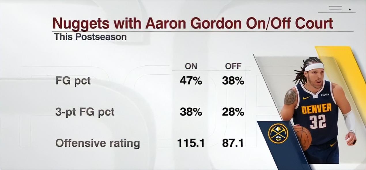 戈登季後賽在場時掘金命中率47%,沒有他只有38%,在場時掘金進攻效率115.1,不在場87.1%,在場時掘金三分命中率38%,不在場三分命中率28%。
