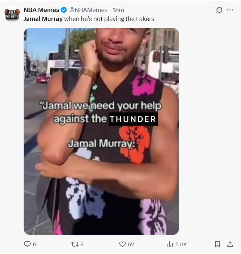 美媒NBA Memes也嘲諷穆雷不打湖人就無法發揮。